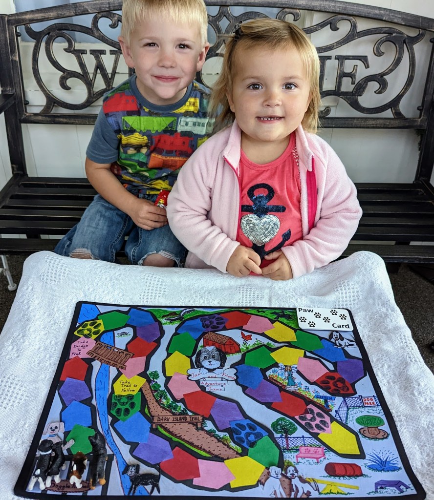 A game where each player moves their doggie on the pathway to play with their friends at the Dog Park by rolling a color cube. Land on a paw, and have some fun by interacting with other players. The game is a completely washable mat, washable doggies, and comes in a lunch cooler back for families to take their game on the go! Visit the on-line store to order now https://authormyday.square.site/ .